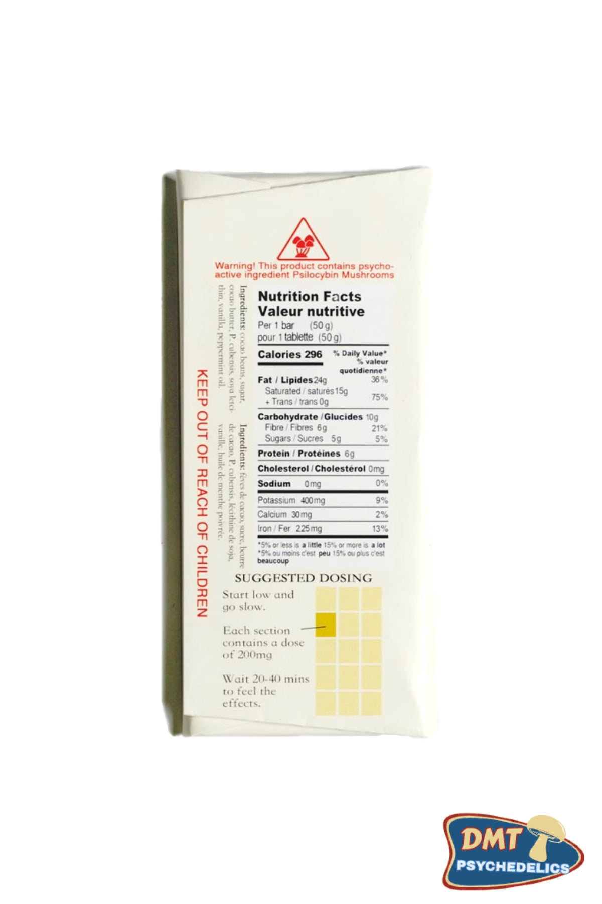 Ingredients: Cocao Beans, Sugar, Cocao Butter, P.Cubensis, Soya Letcithin, Vanilla, Peppermint Oil. (May contain traces of milk, nuts)